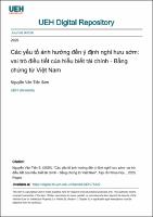 Các yếu tố ảnh hưởng đến ý định nghỉ hưu sớm: vai trò điều tiết của hiểu biết tài chính - Bằng chứng từ Việt NamNghiên cứu này phân tích các yếu tố ảnh hưởng đến ý định nghỉ hưu sớm của người lao động, tập trung vào quản lý tài chính cá nhân, hiểu biết tài chính, điều kiện làm việc và tác động từ môi trường xã hội. Dựa trên dữ liệu thu thập 760 phiếu khảo sát sau khi đã loại bỏ các phiếu không thoả mãn nhằm đảm bảo tính tin cậy với phương pháp mô hình cấu trúc bình phương nhỏ nhất (PLS- SEM) được sử